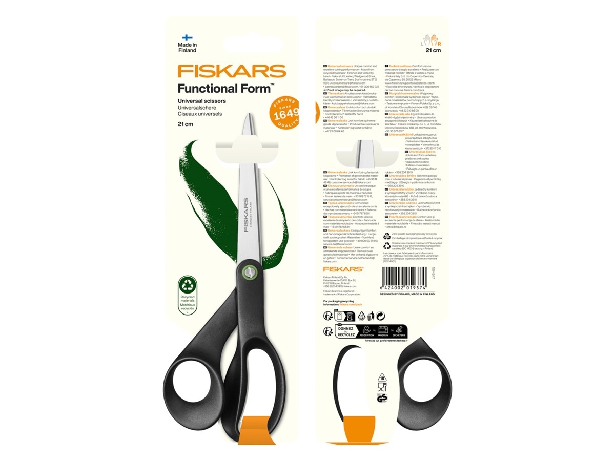 Die 21 cm lange Fiskars Functional Form-Schere ist eine ausgezeichnete Investition in Nachhaltigkeit und Benutzerfreundlichkeit. Die Kombination aus der bewährten Fiskars-Qualität und der Verwendung von recycelten Materialien zeigt, dass Leistung und Verantwortung perfekt zusammenpassen.