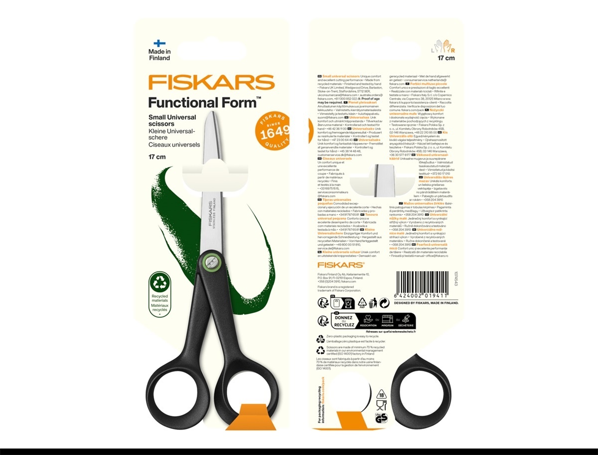 Die 17 cm lange Fiskars Functional Form-Schere ist eine ausgezeichnete Investition. Die Kombination aus der bewährten Fiskars-Qualität und der Verwendung von recycelten Materialien zeigt, dass Leistung und Nachhaltigkeit perfekt zusammenpassen.