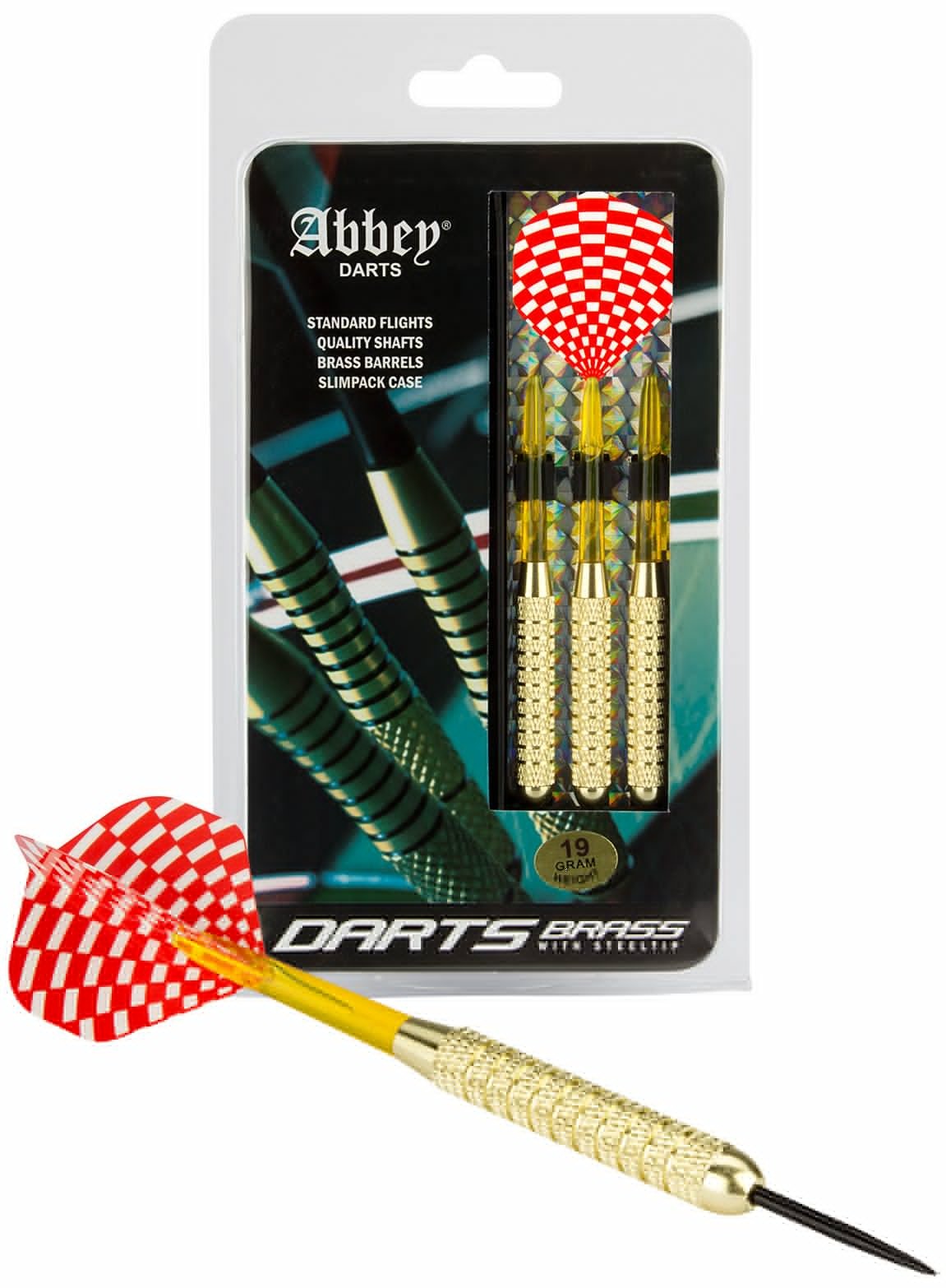 Set von 3 Messing -Dart -Pfeilen von Abbey Darts mit zusätzlichen Setflügen.