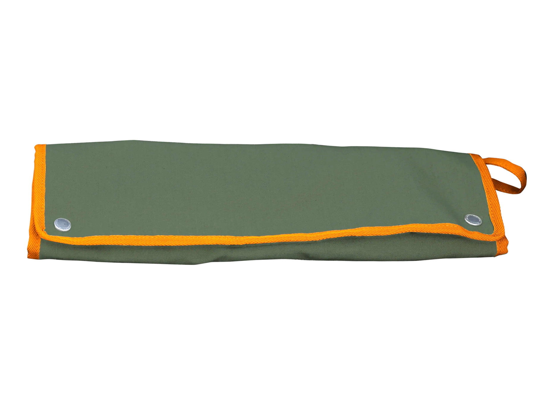 Das Etui ist aus strapazierfähigem, recyceltem Polyester in einem eleganten Olivgrün gefertigt. Dieses umweltfreundliche Material ist zudem mit einer Schutzschicht imprägniert, so dass die Tasche leicht zu reinigen ist und Ihre Werkzeuge vor Schmutz und Feuchtigkeit geschützt sind. Der robuste Druckknopfverschluss sorgt dafür, dass die Messer während des Transports sicher an ihrem Platz bleiben und nicht beschädigt werden.