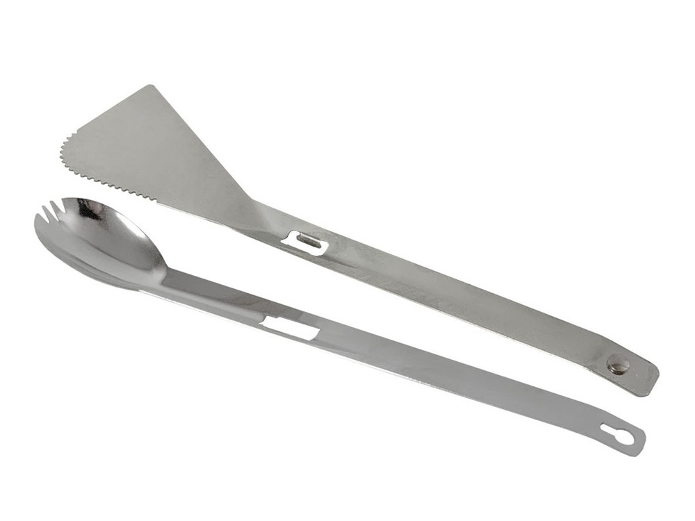 Der Göffel vereint die Funktionen eines Löffels und einer Gabel, so dass Sie kein loses Besteck mit sich führen müssen. Der Spatel hat auf einer Seite eine gezahnte Kante, so dass er auch als praktisches Brotmesser verwendet werden kann. Das gesamte Set besteht zu 100 % aus rostfreiem Stahl, was Langlebigkeit, Hygiene und einfache Reinigung nach dem Gebrauch garantiert. Zu einer Zange zusammengebaut, haben Göffel und Spatel eine komfortable Länge von 25,50 cm und ein geringes Gewicht von nur 144 Gramm. Das Design stammt von Pathfinder, bekannt für seine praktische Outdoor-Ausrüstung.