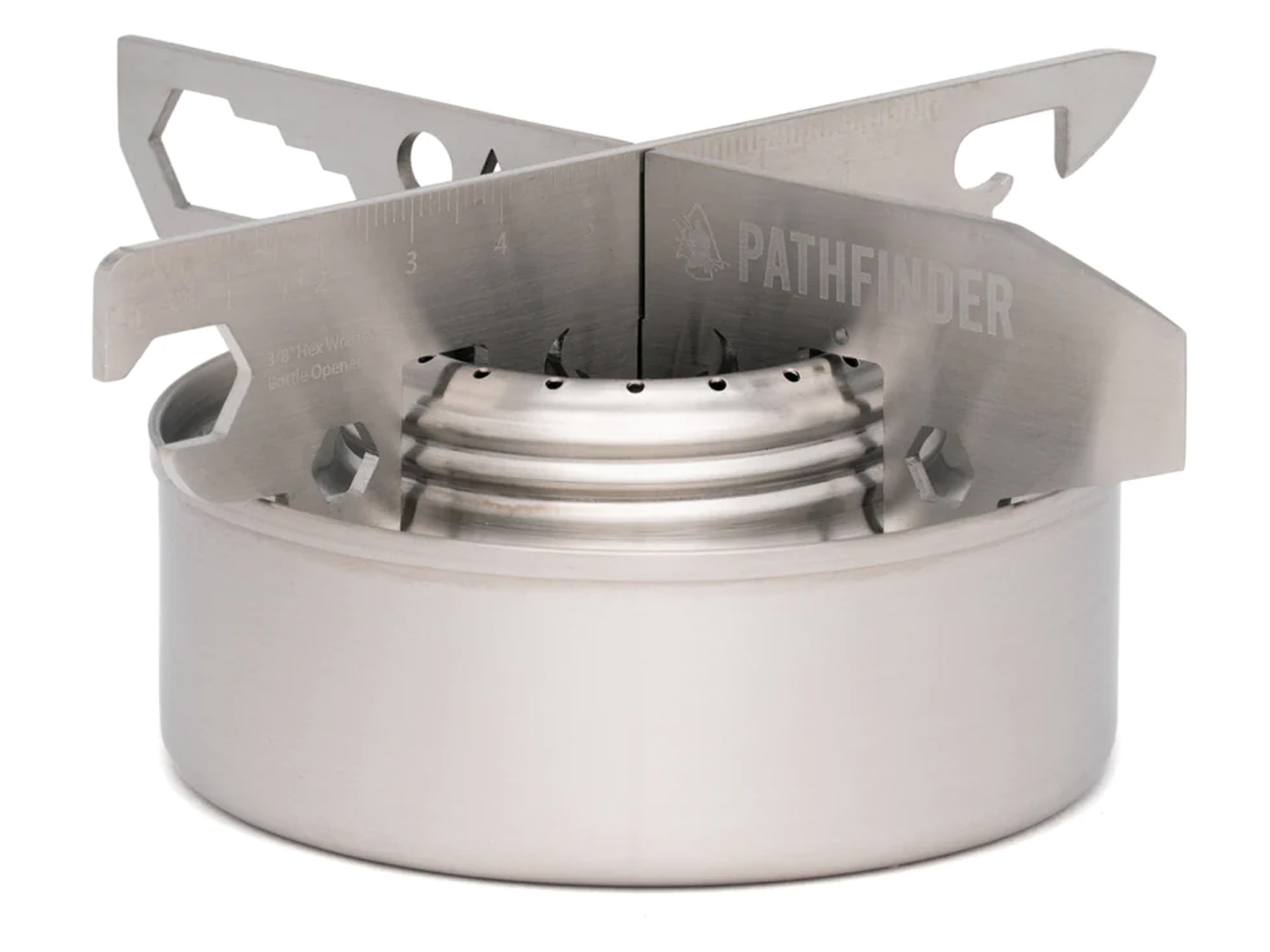 Der Pathfinder Multifunktionsständer ist ein kompakter und leichter Edelstahlständer für Spiritusbrenner, kombiniert mit einem 10-in-1-Multitool einschließlich Öffner, Sechskantbithalter, Lineal, Schraubenschlüssel und mehr. Ein vielseitiges Must-have für Outdoor-Aktivitäten.