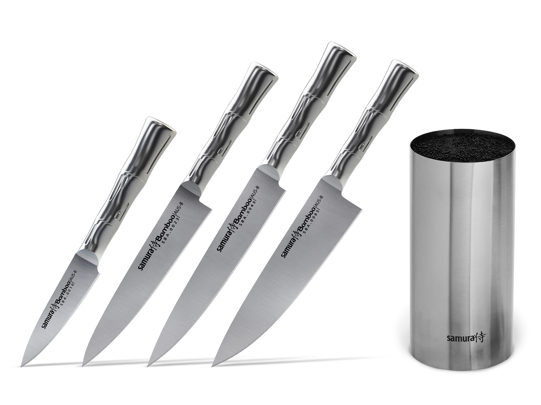 Das Samura Bamboo ist ein modernes Set aus 4 Küchenmessern + Edelstahlblock im Bambus-Stil, geeignet für den professionellen Einsatz.