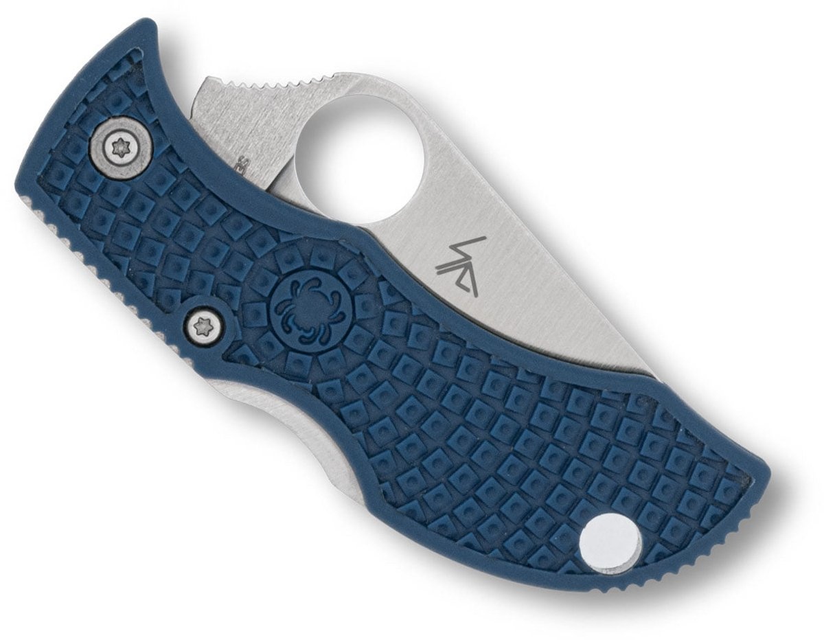 Der Griff besteht aus leichtem, glasfaserverstärktem Nylon (FRN) in einer charakteristischen kobaltblauen Farbe. Die bidirektionale Textur sorgt für einen festen, rutschfesten Griff, selbst unter nassen oder kalten Bedingungen. Das klassische runde Öffnungsloch von Spyderco ermöglicht ein einfaches Öffnen der Klinge mit einer Hand, während die zuverlässige Rückverriegelung für einen soliden und sicheren Halt während des Gebrauchs sorgt.