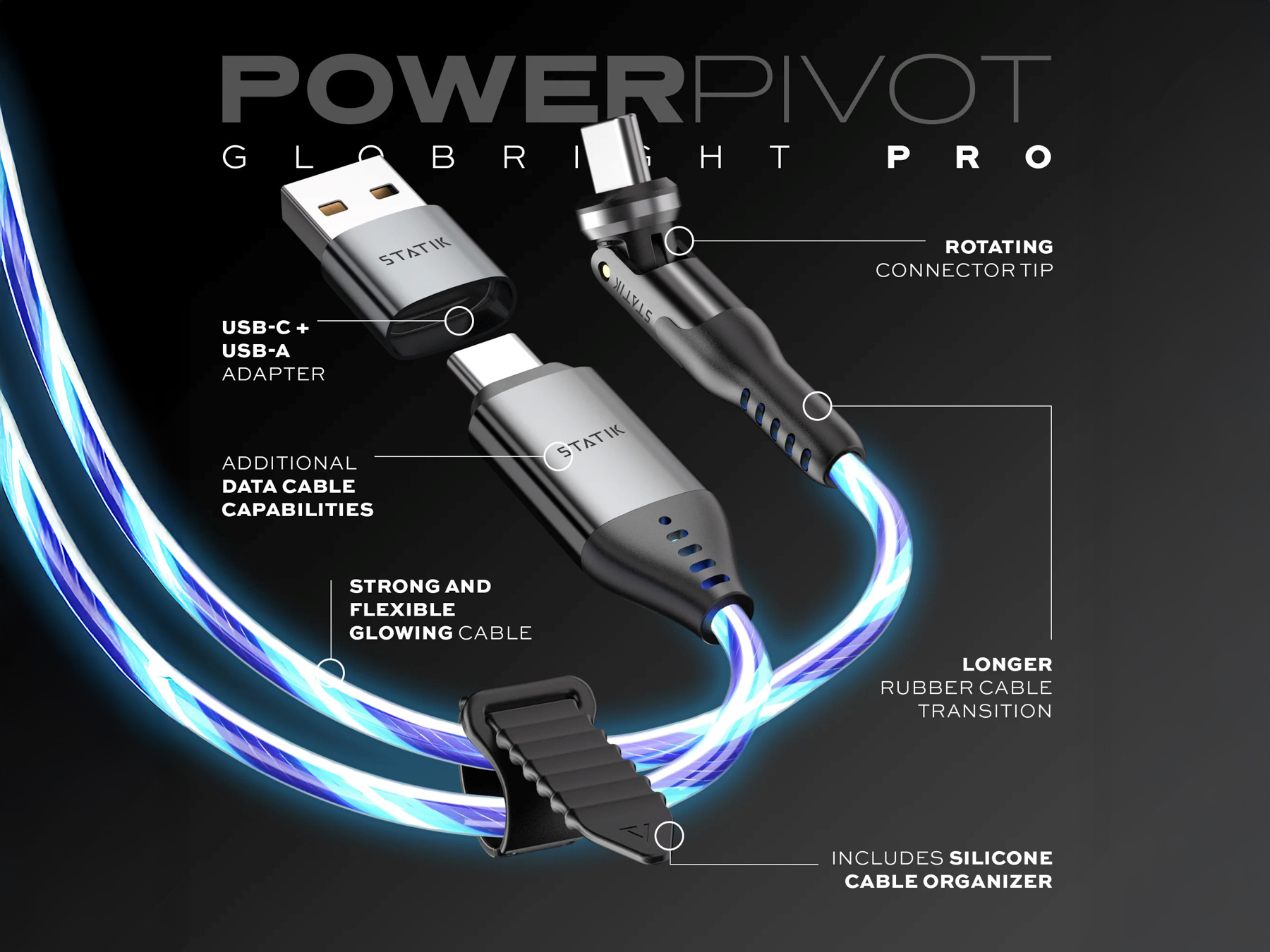 Das Statik PowerPivot GloBright Pro ist ein 2 Meter langes USB-C-auf-USB-C-Kabel mit einer einzigartigen drehbaren Spitze, die ein Ausfransen verhindert. Die militärtaugliche Nylonkonstruktion sorgt für extreme Langlebigkeit, während die 60W BlitzCharge eine schnelle Aufladung gewährleistet. Ein USB-A-Adapter und ein Organizer aus Silikon sind für zusätzlichen Komfort im Lieferumfang enthalten.