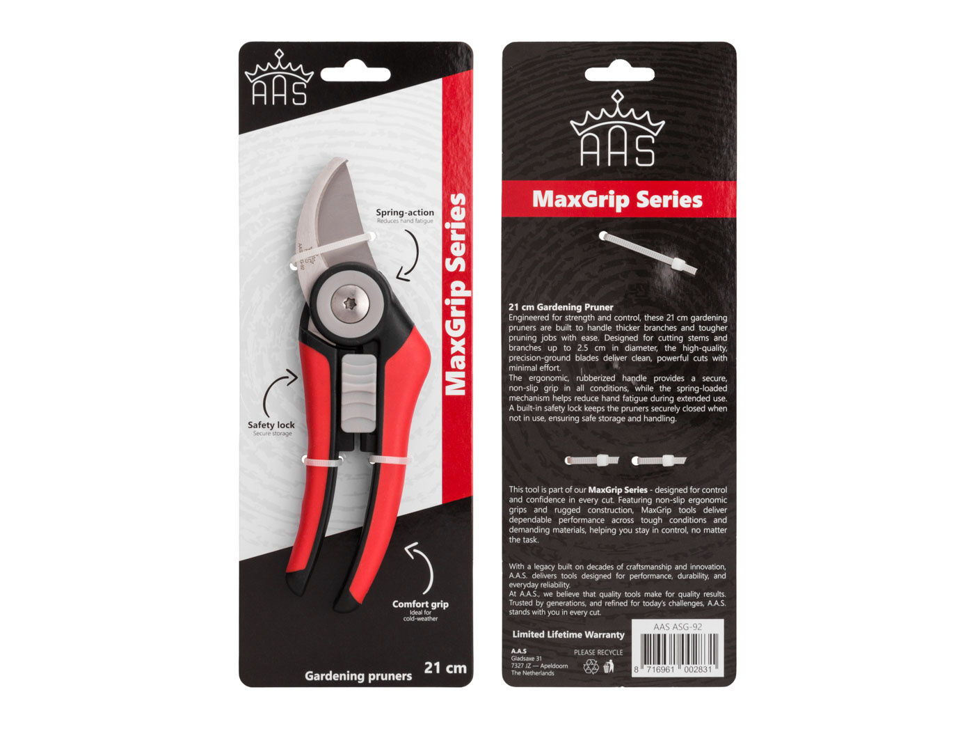 The A.A.S. MaxGrip Gardening Pruners are powerful and comfortable pruning shears. The anvil mechanism and AISI 420 stainless steel blade ensure effortless cutting and durability. The ergonomic FRN/TPE handles and automatic spring guarantee comfort, even during prolonged use.