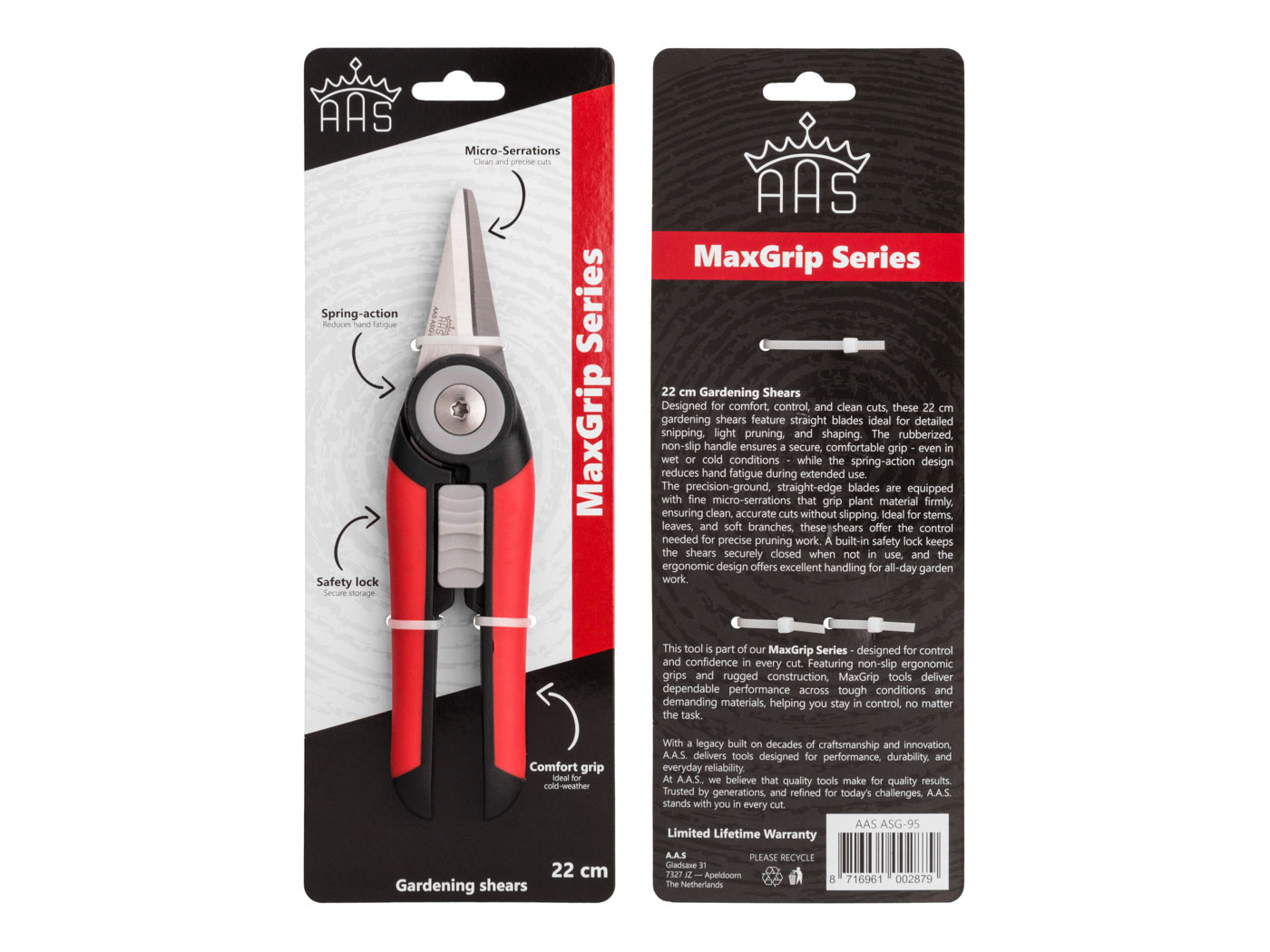The A.A.S. MaxGrip Gardening Shears are high-quality harvesting shears for anyone who values precision, comfort, and durability. These lightweight yet strong shears are ideal for harvesting herbs, vegetables, fruit, or flowers, but are also perfect for fine pruning and detailed tasks in the garden or greenhouse.