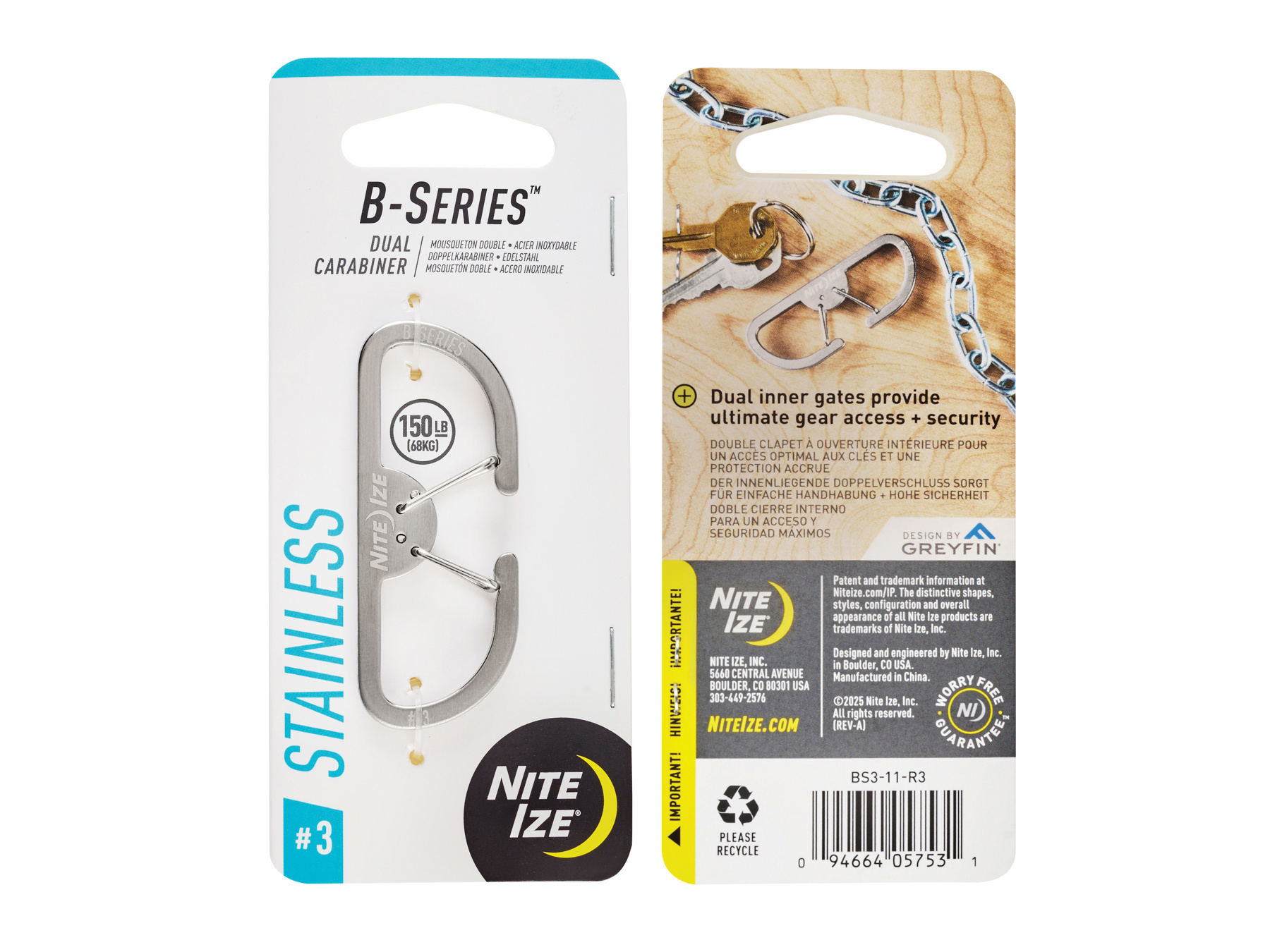 The Nite Ize B-Series Carabiner #3 is a precision-designed carabiner built for heavy-duty work. With its unique double inner gates and rugged construction of high quality stainless steel, this carabiner can safely carry loads up to 90 pounds. The innovative design provides an extra level of security and reliability for all your fastening needs.