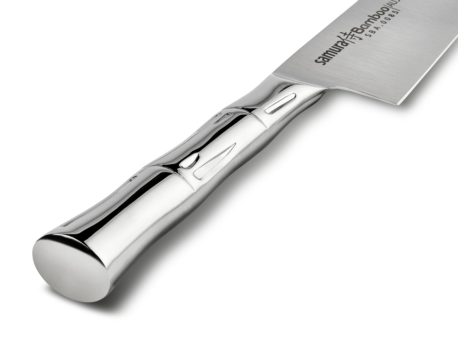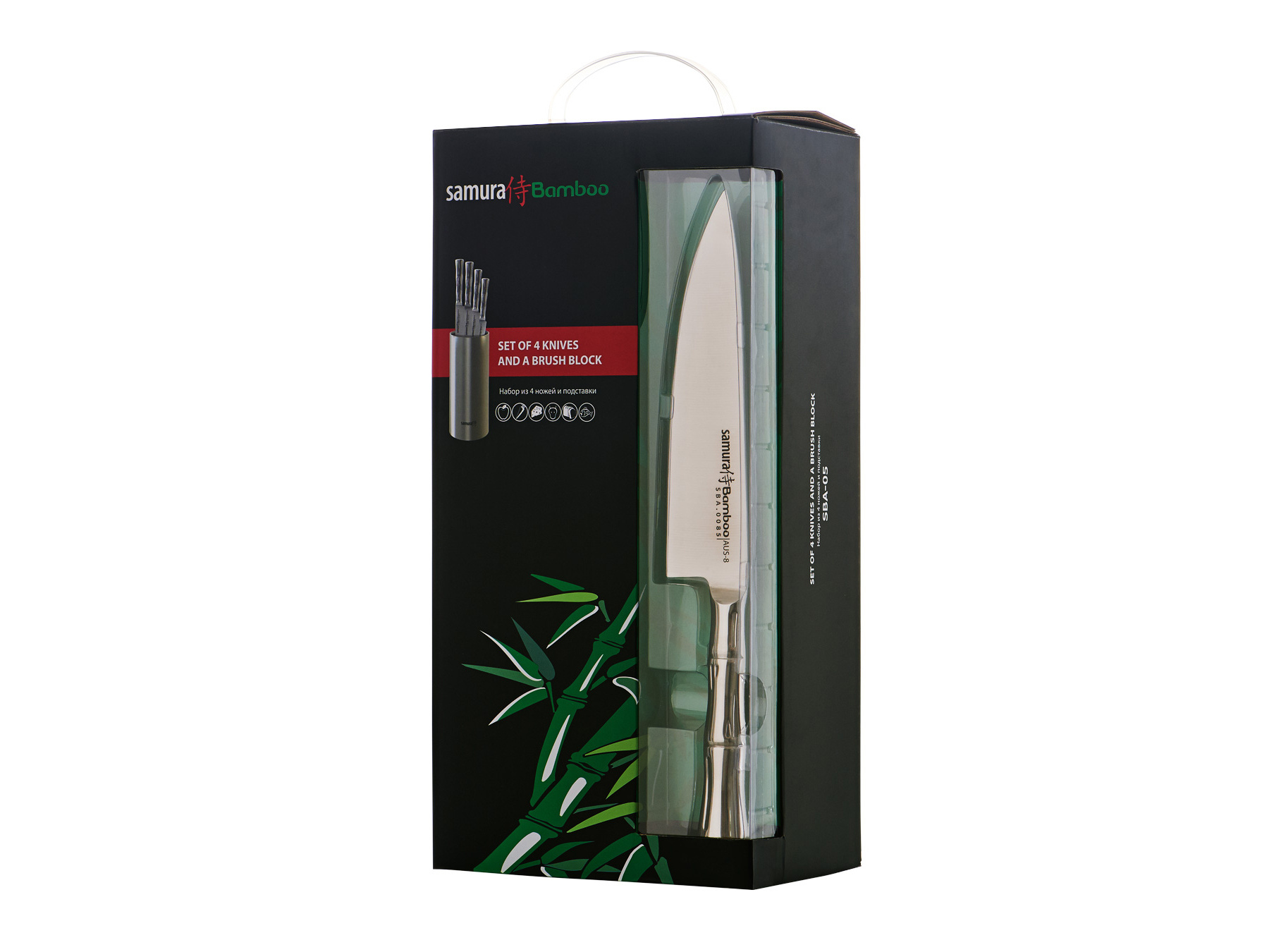 The Samura Bamboo is a modern set of 4 kitchen knives + stainless steel block, in bamboo style suitable for professional use.