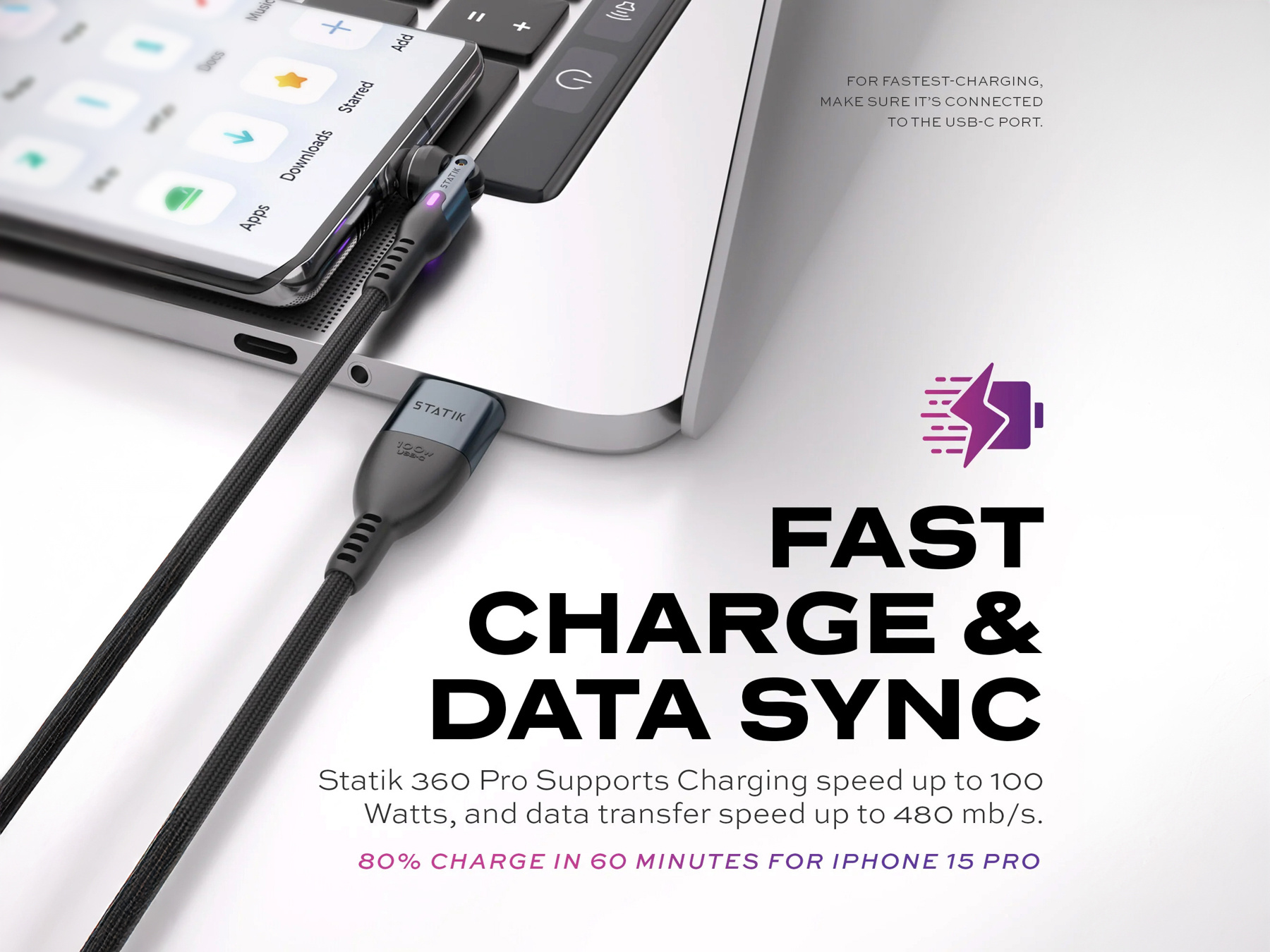 The Statik 360 Pro is a 2-meter long universal magnetic cable with Lightning, USB-C and Micro-USB tips, plus a USB-C to USB-A adapter. With BlitzCharge up to 100W, 360° rotating tips and a handy organizer, this is the ultimate charging solution for all your devices.