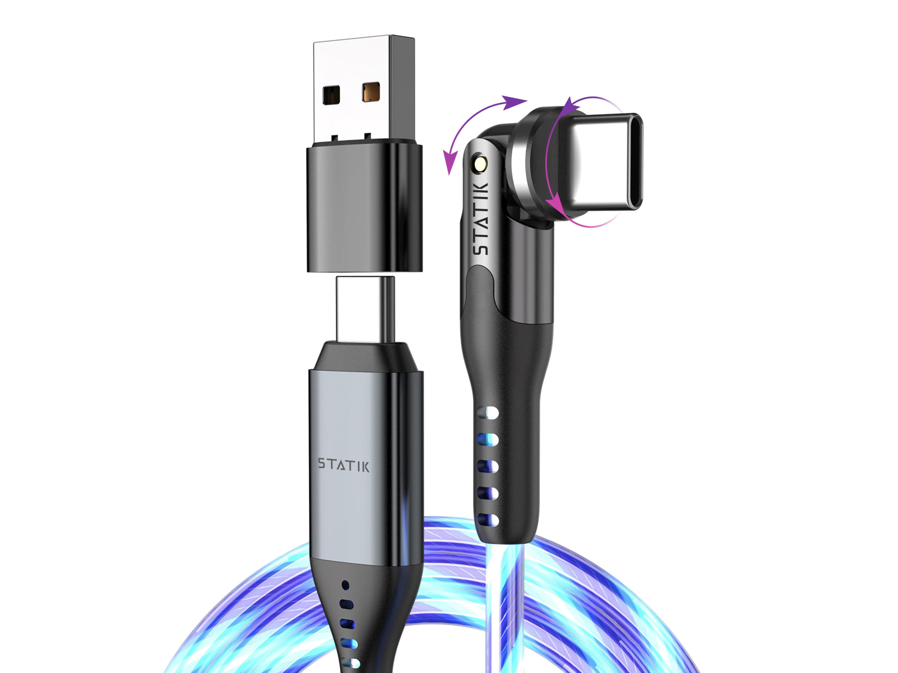 The Statik PowerPivot GloBright Pro is a 2-meter-long USB-C to USB-C cable with a unique rotating tip to prevent fraying. The military-grade nylon construction provides extreme durability, while the 60W BlitzCharge ensures fast charging. A USB-A adapter and silicone organizer are included for added convenience.