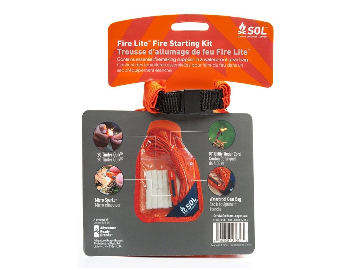 Le kit allume-feu SOL (Survive Outdoors Longer) Fire Lite est un ensemble compact et complet qui contient tous les outils essentiels pour allumer un feu rapidement et de manière fiable dans toutes les conditions. Conçu dans un souci de survie et de commodité, ce kit est un élément indispensable de tout équipement de plein air ou d'urgence.