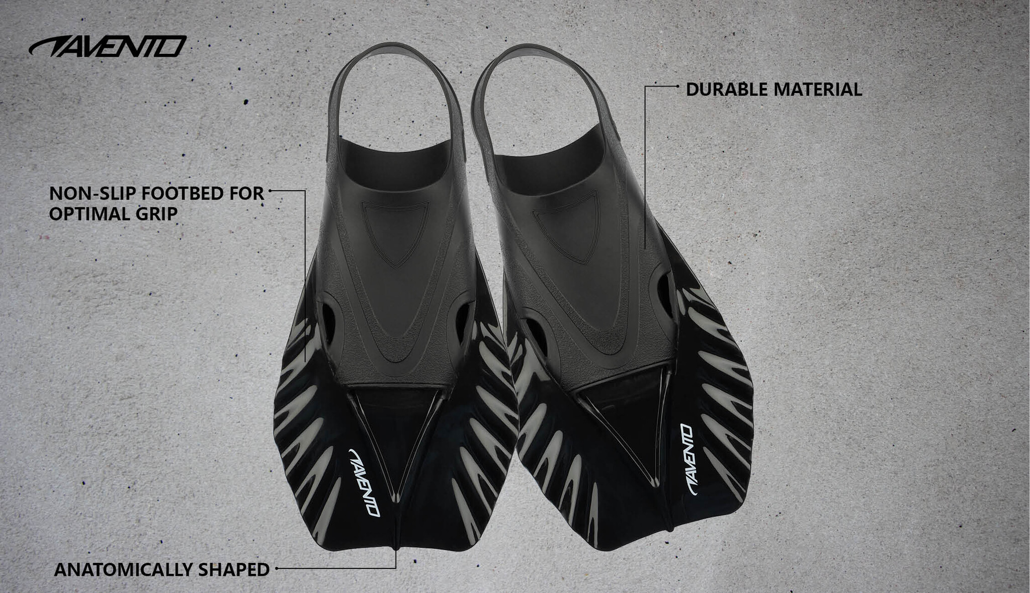 De compacte Avento zwemvliezen zijn de perfecte tool voor wedstrijdzwemmers en zwemmers die hun beenspieren willen trainen en hun techniek willen verbeteren. De zwemvinnen zijn specifiek ontworpen om extra weerstand en een natuurlijk slagpatroon te creëren.