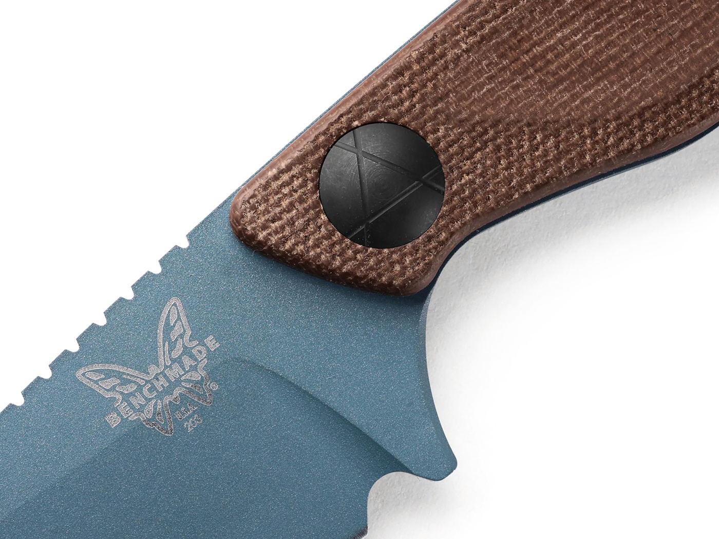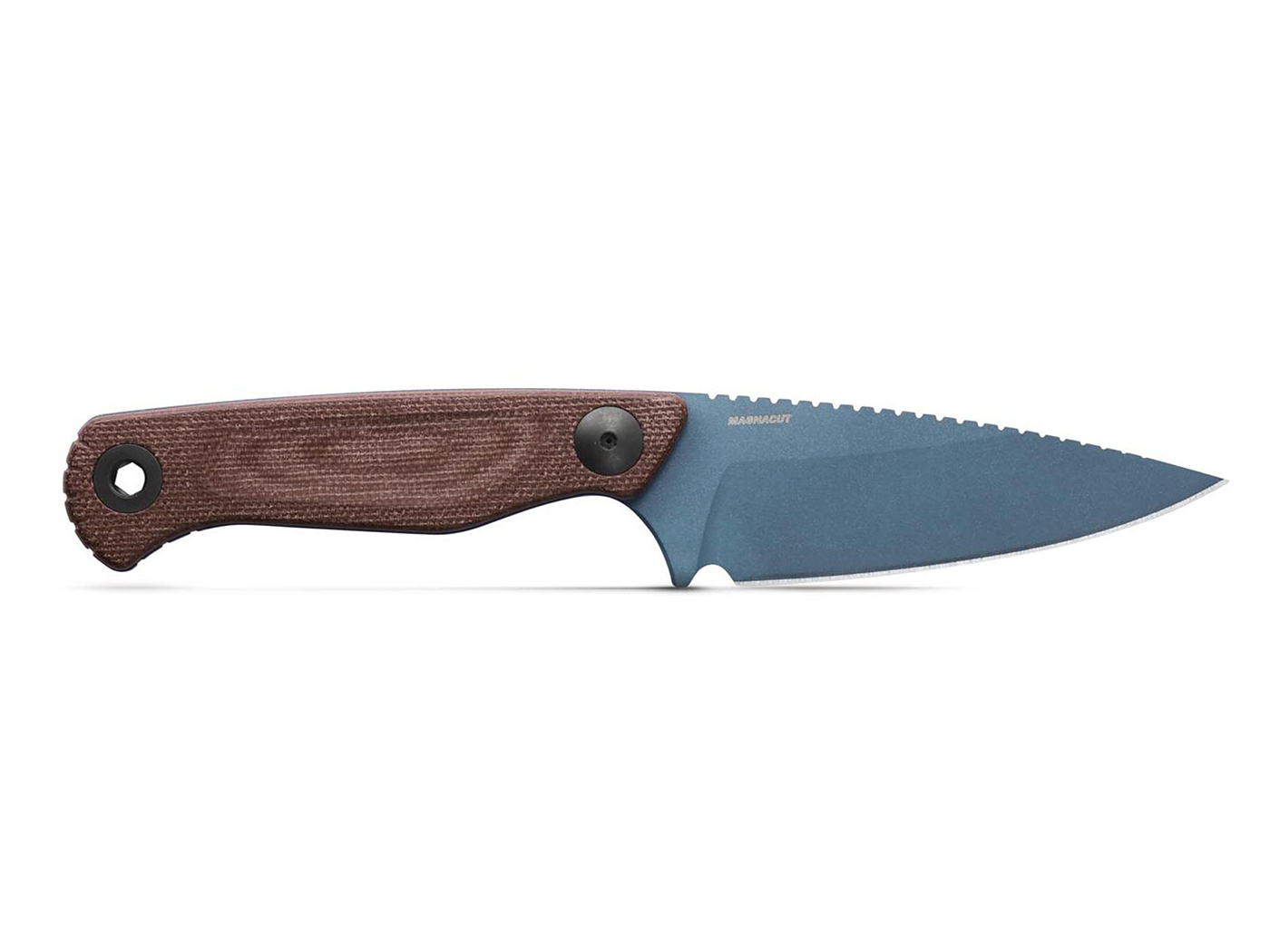 - Handvat: Het handvat is gemaakt van bruin Canvas Micarta. Dit lichte, stevige materiaal ontwikkelt over tijd een unieke patina en zorgt voor extra houvast in verschillende greep-posities, zelfs onder natte omstandigheden.